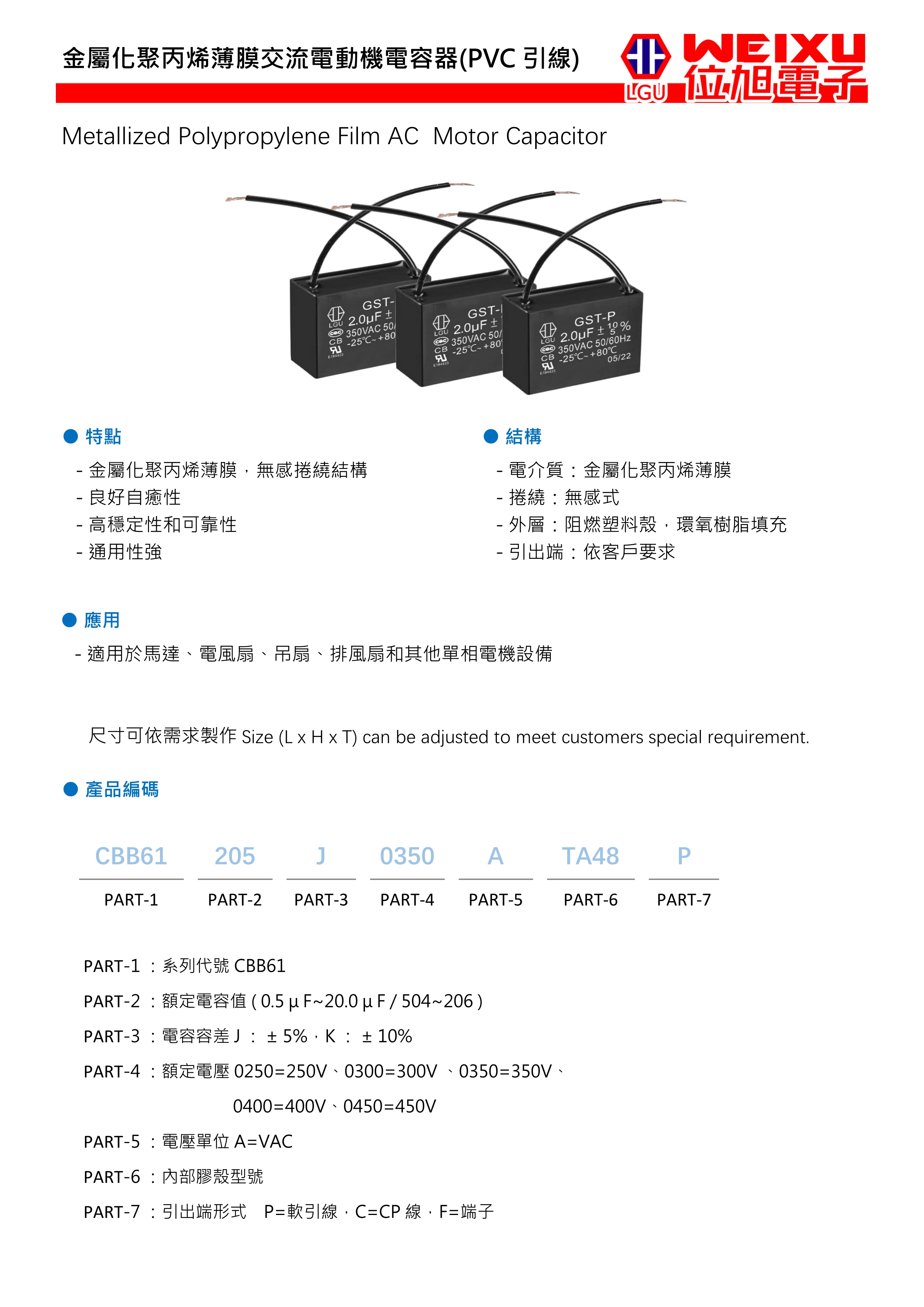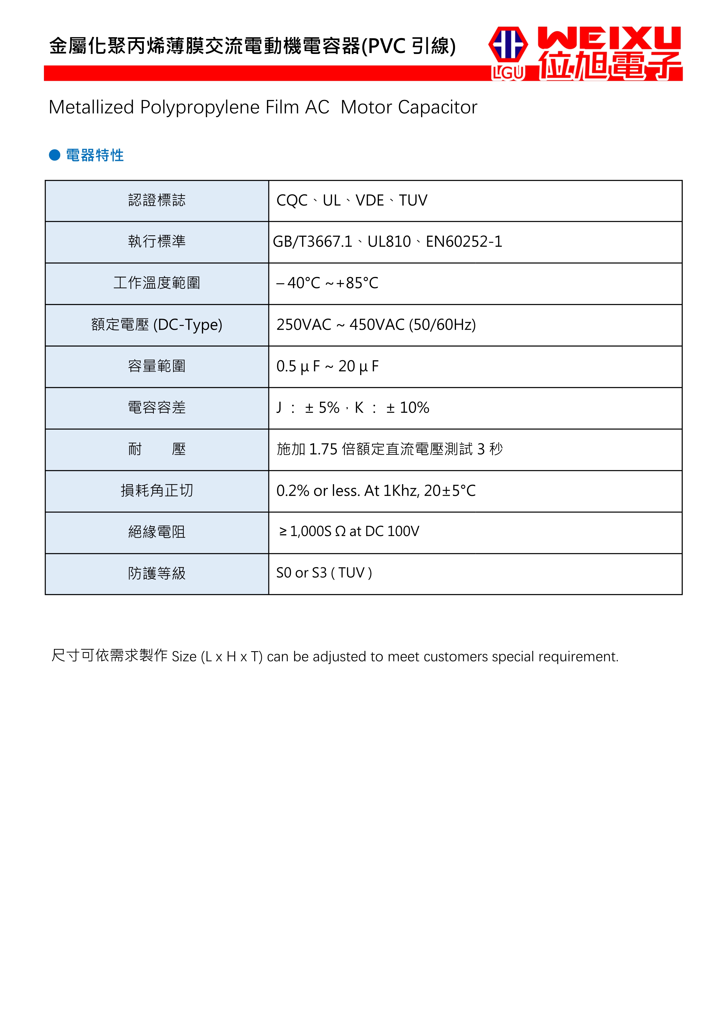 容量范圍(uF):1.0~14 額定電壓(Vac):400V 額定溫度:-25℃~85℃
