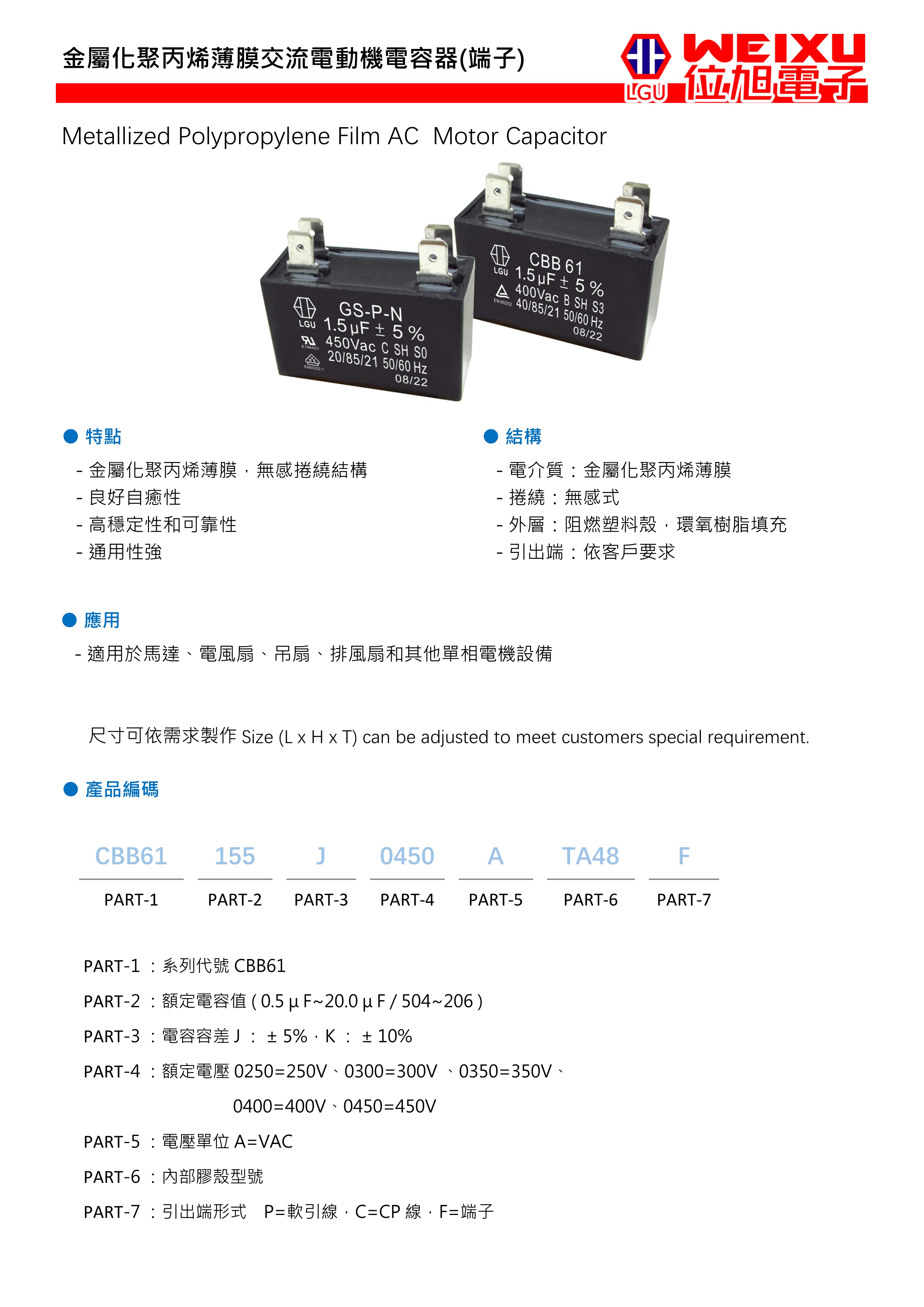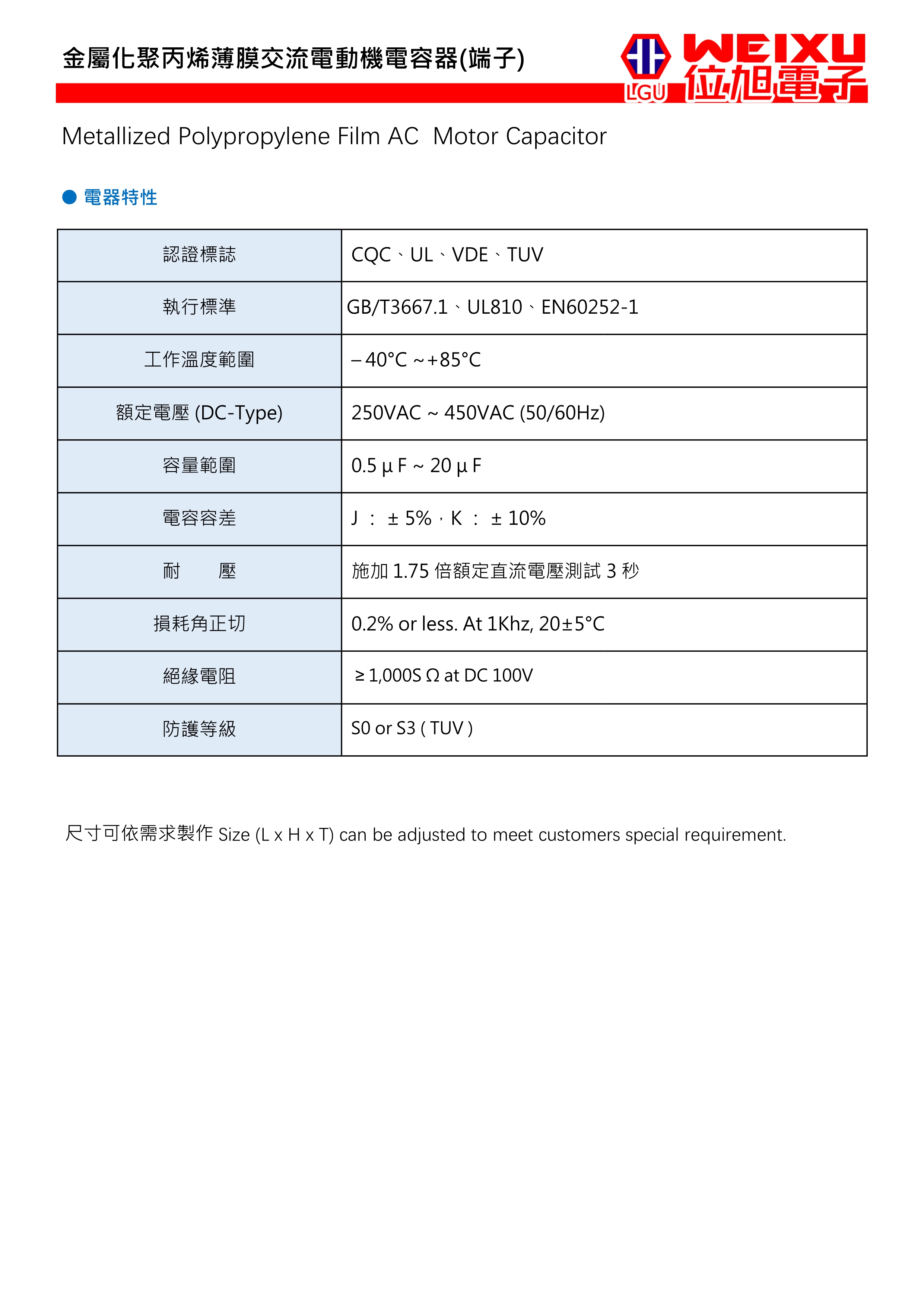 容量范圍(uF):0.5 ~ 20 額定電壓(Vac):250~450V 額定溫度:-25℃~85℃