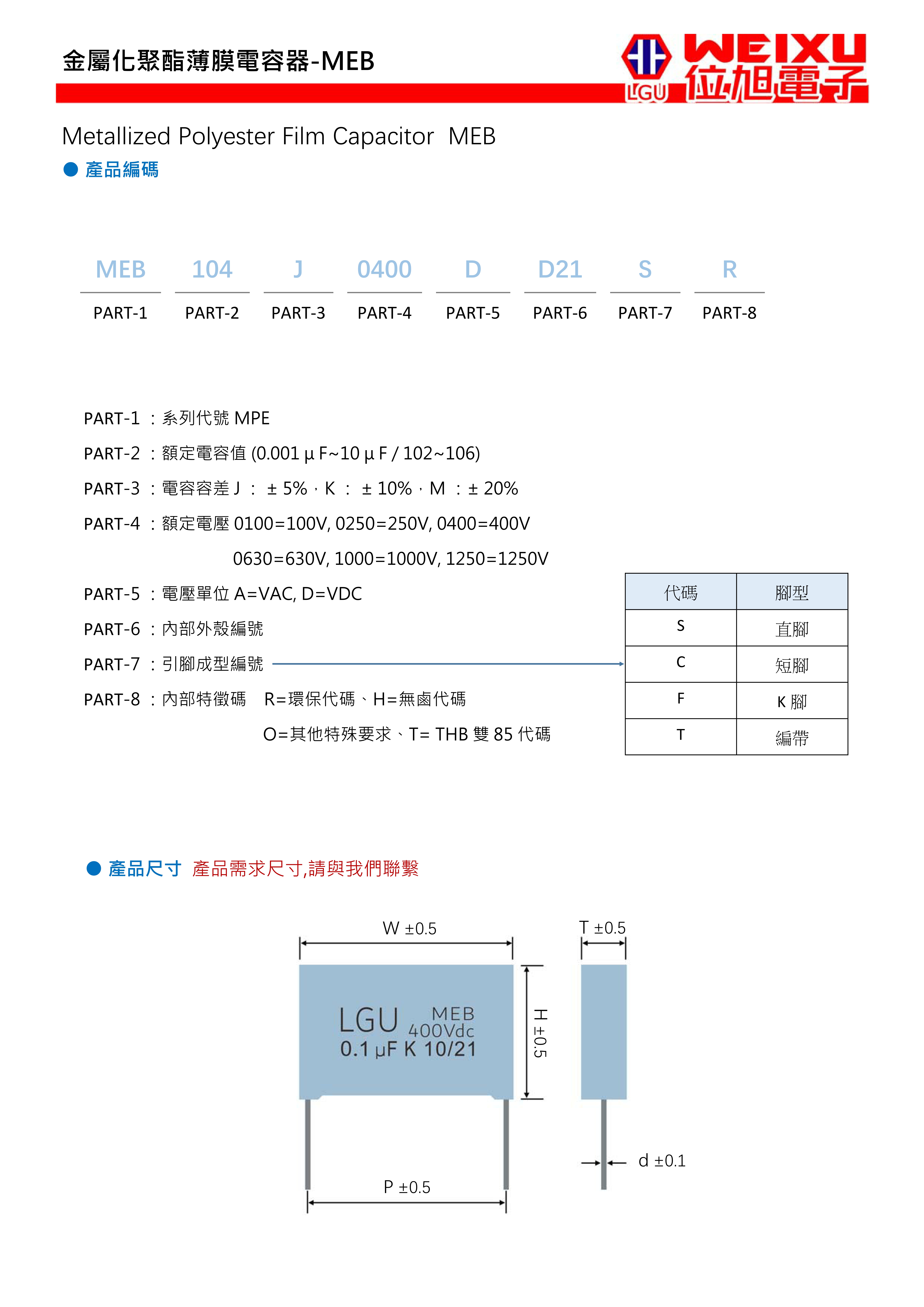 型號(hào)(TYPE):MEB 盒式 容量范圍(uF):0.001~10.0 額定電壓(Vdc):100V,250V,400V,630V,1000V,1250V 工作溫度:-40℃~105℃ 額定溫度:85℃