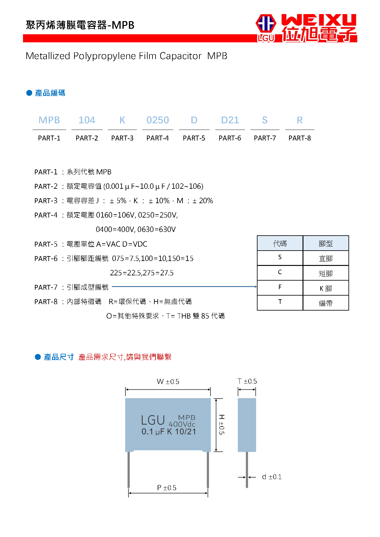型號(uF):MPB 盒式 容量范圍(uF):0.01~10.0 額定電壓(Vdc):100V,250V,400V,450V,630V 工作溫度:-40℃~105℃ 額定溫度:105℃
